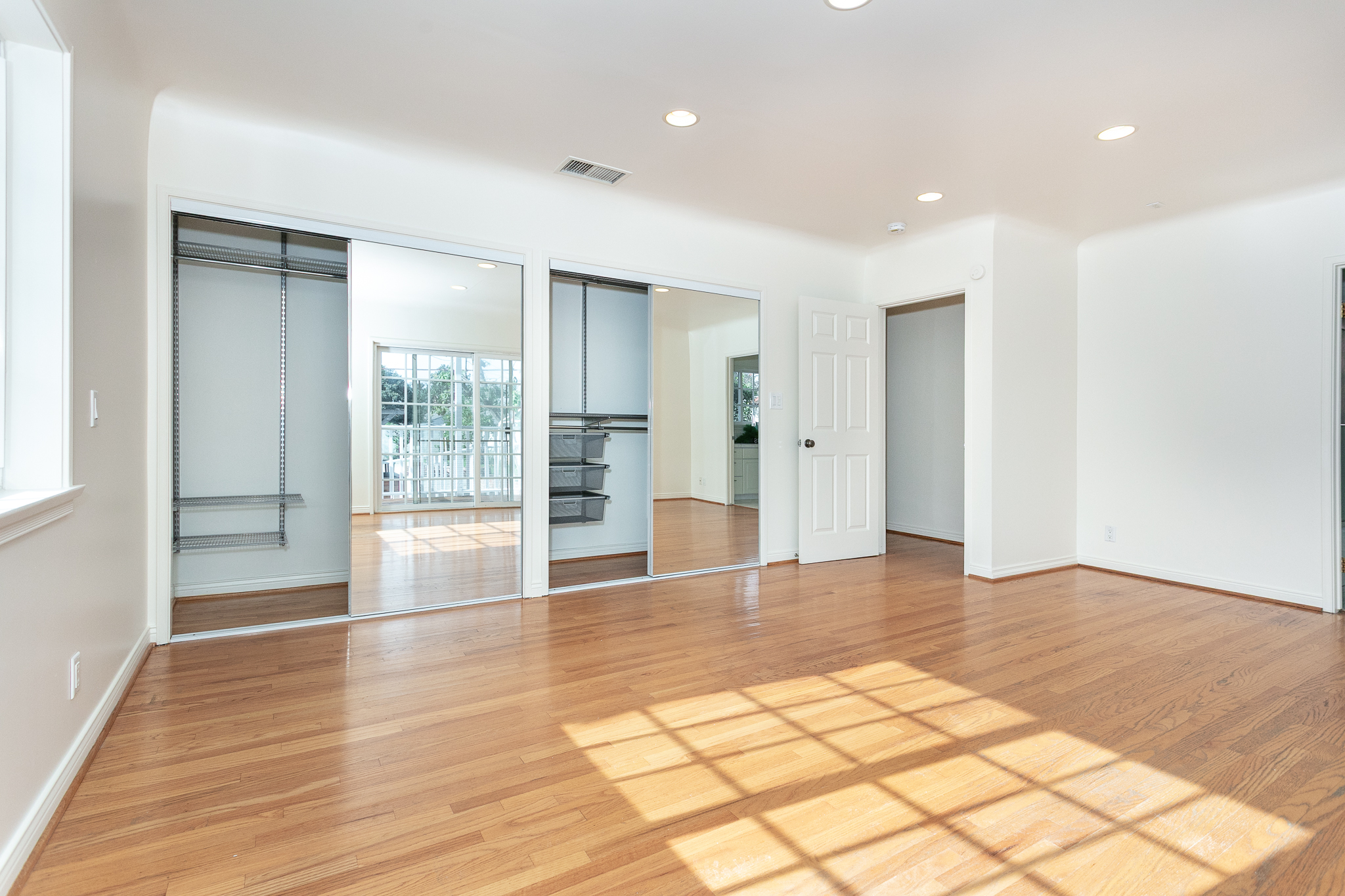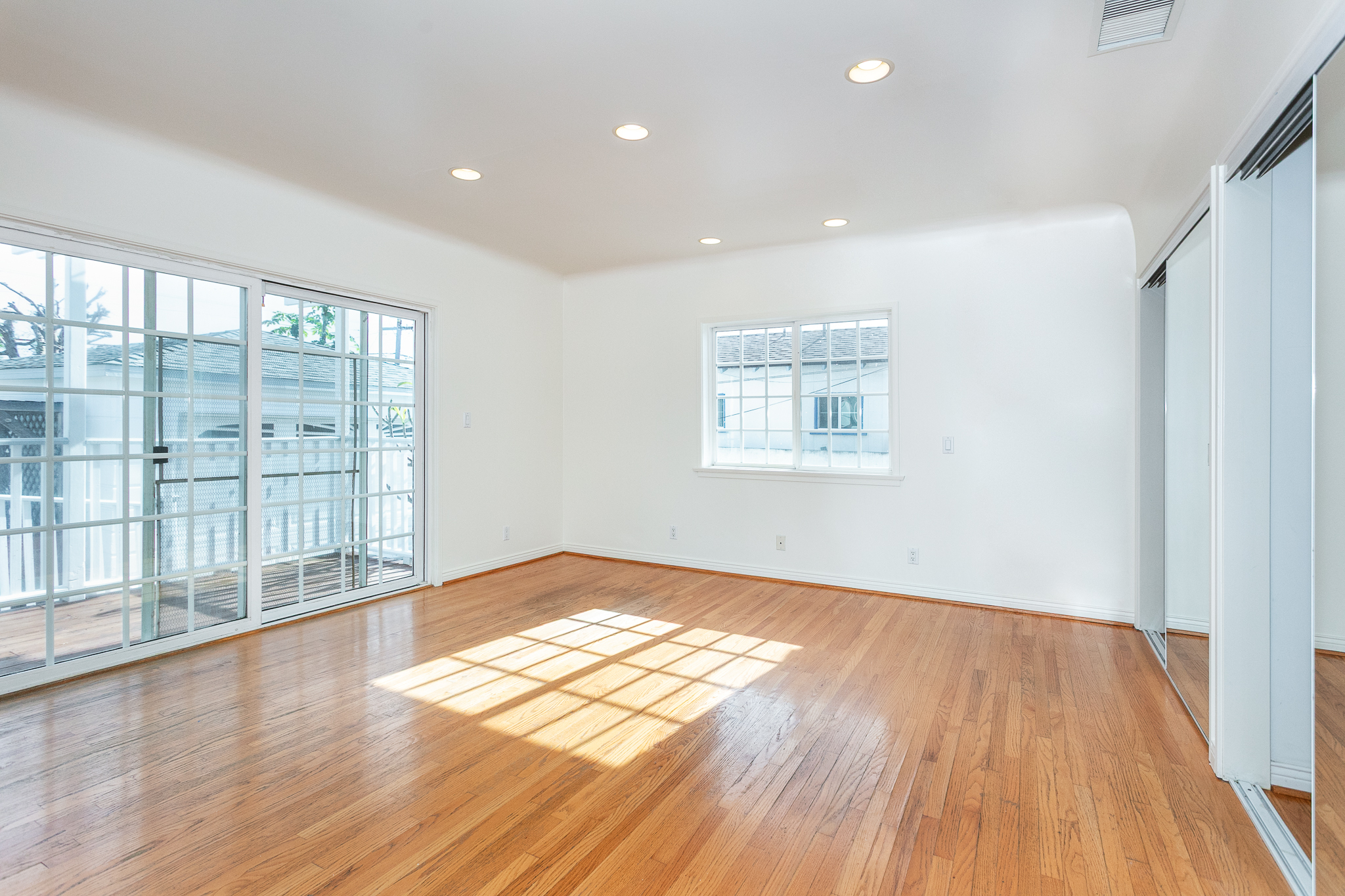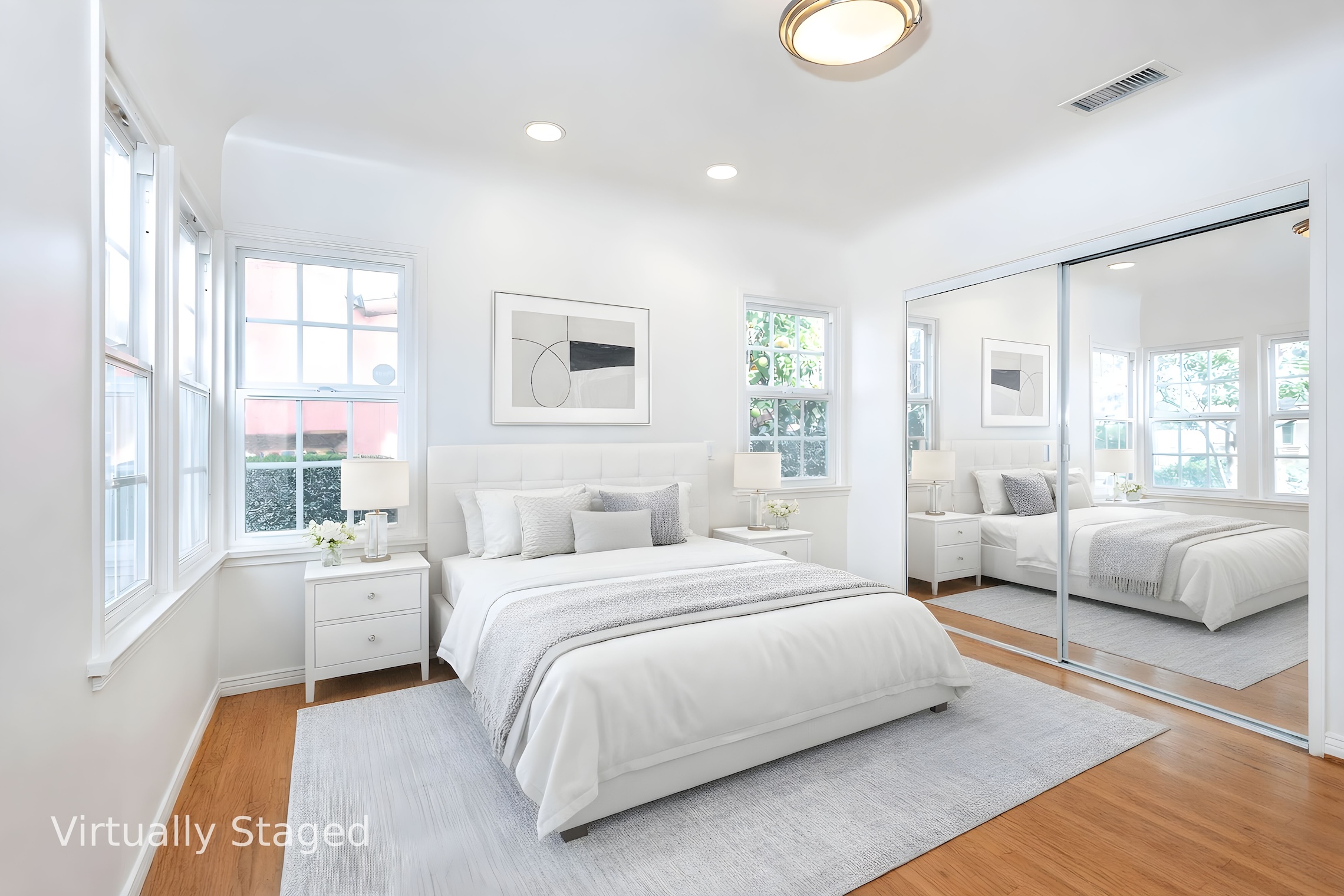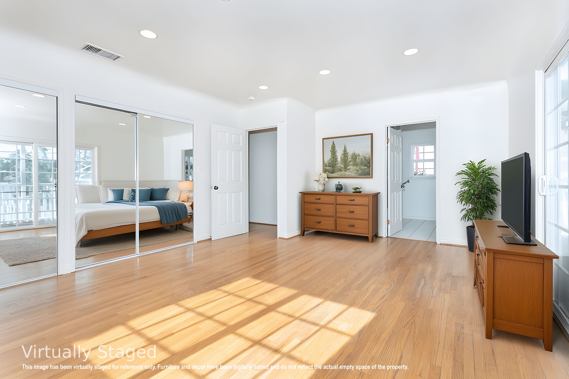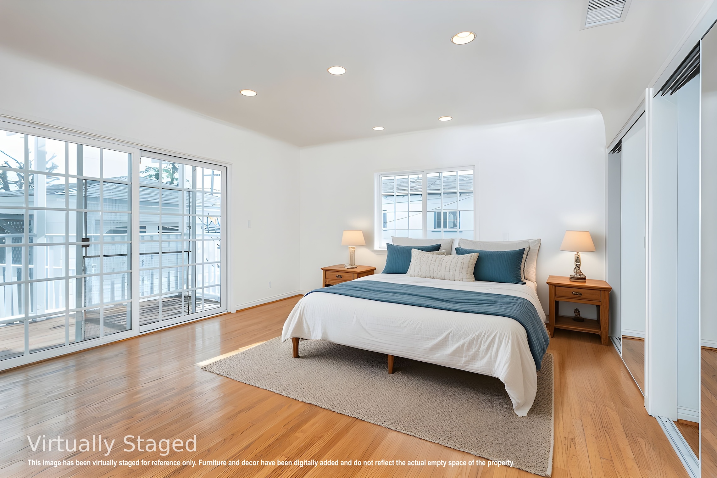The home consists of three bedrooms and two bathrooms, with mirrored sliding closets featuring built-in shelvingfor added storage and organization. The spacious primary bedroom is filled with natural light and provides direct accessto a private patio, creating an inviting indoor-outdoor retreat.