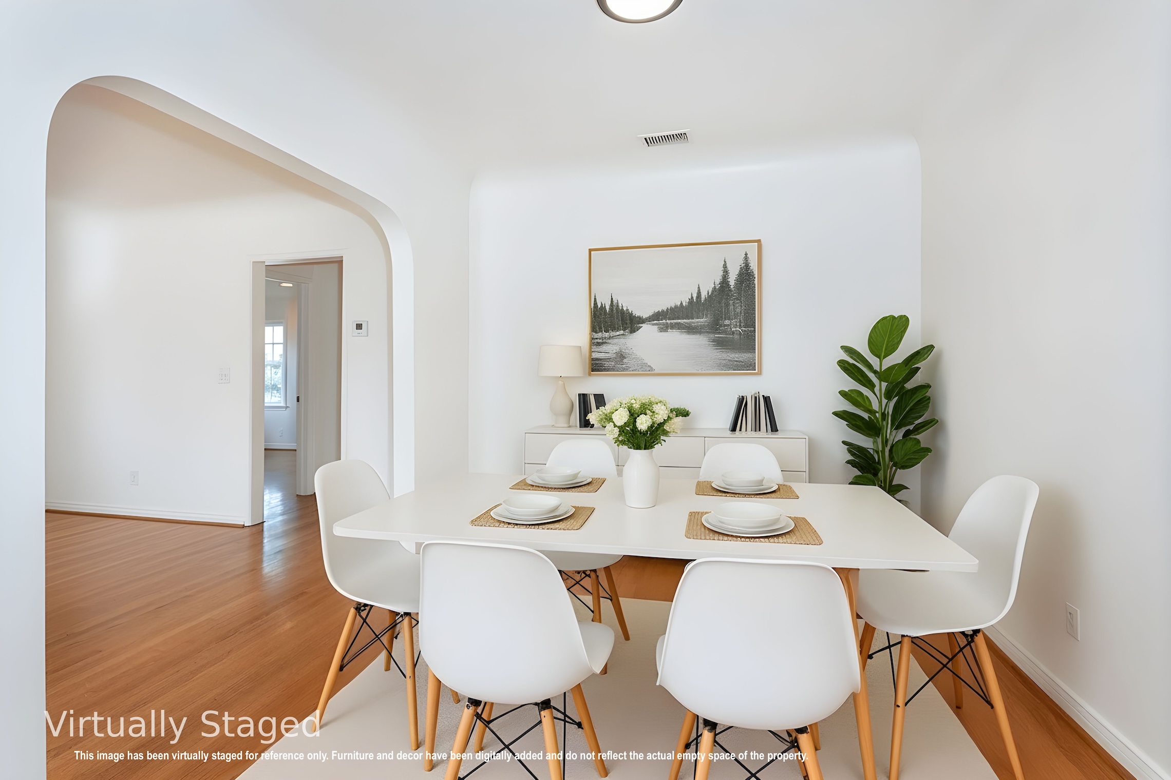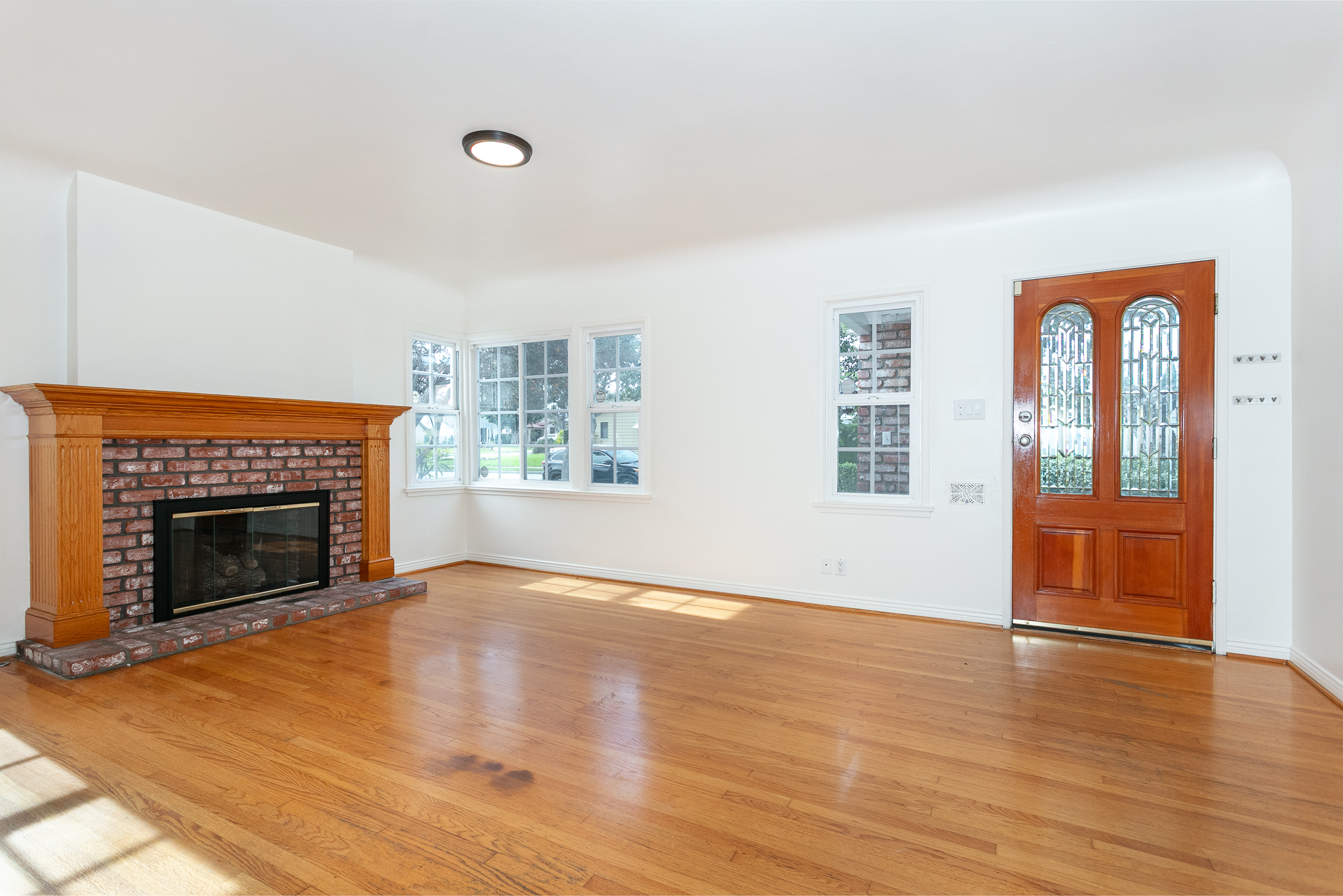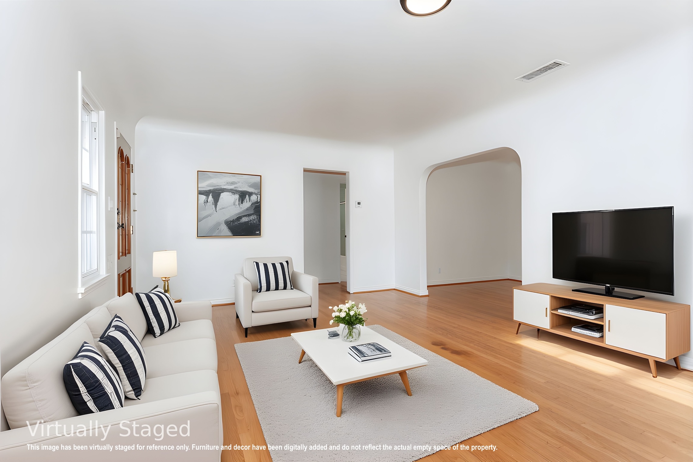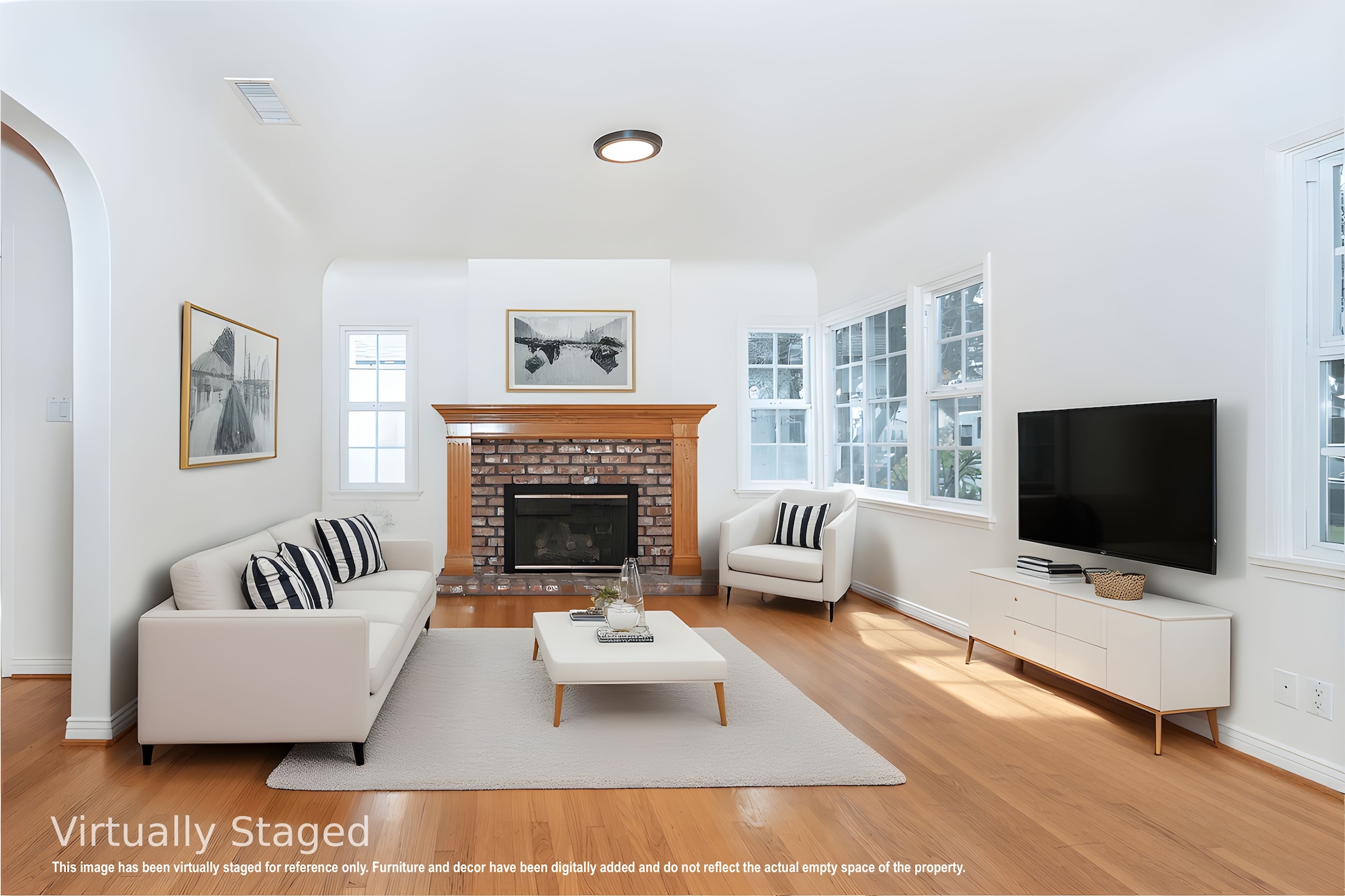 The inviting living room showcases a cozy brick fireplace that creates a warm atmosphere for family gatherings, while an elegant arched opening seamlessly connects to the dining room, making it ideal for everyday meals.