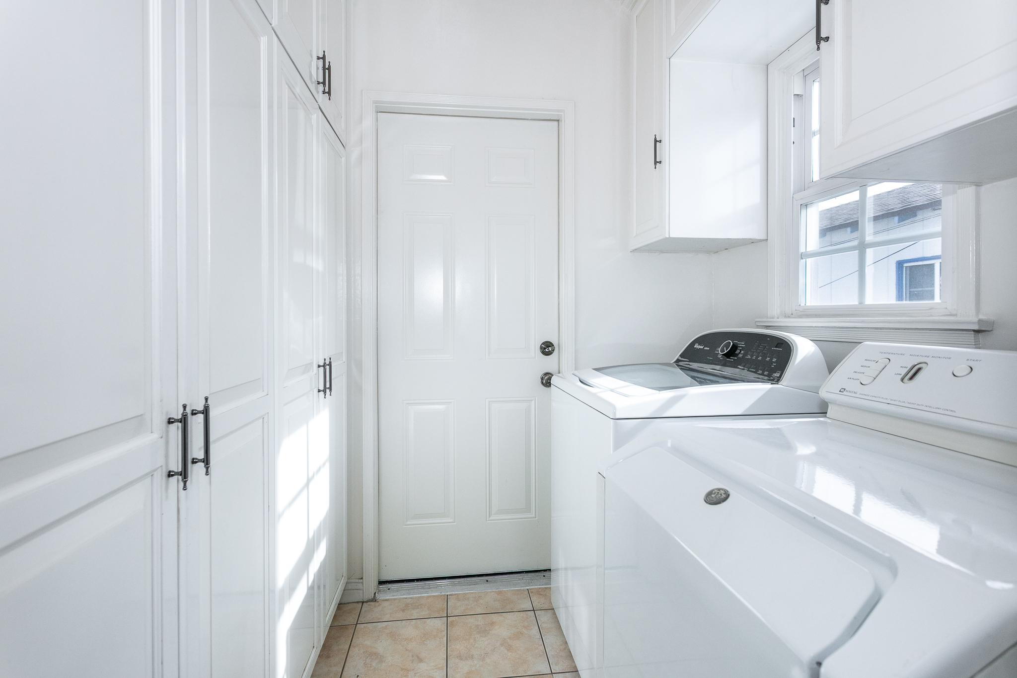 The gourmet kitchen is filled with natural light from bay-style windows and is complemented by tile flooring, ample cabinetry, and a functional layout ideal for everyday cooking and dining. An adjacent dedicated laundry room adds convenience with washer/dryer hookups and built-in storage.